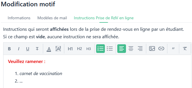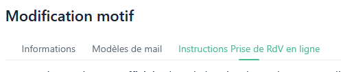 Lorsqu’un motif est disponible à la prise de rendez-vous en ligne, il est possible d’ajouter des instructions supplémentaires que les étudiants verront, via l’onglet « Instructions Prise de RdV en ligne » situé en haut de la fenêtre.