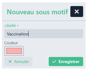 Pour la couleur, celle-ci est par défaut celle du motif parent. En choisissant un autre couleur, les rendez-vous liés à ce sous-motif aura une autre couleur sur le planning.