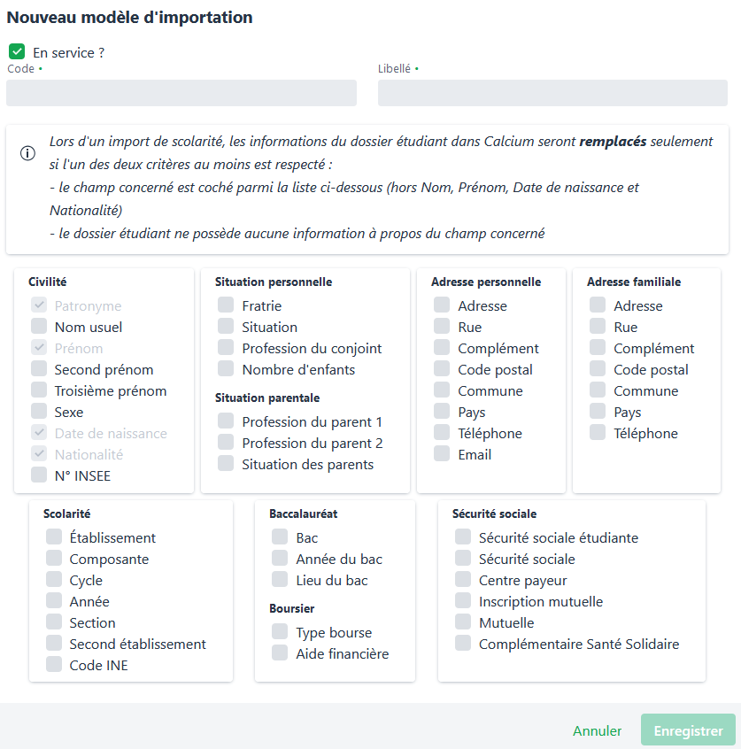 Lors de la création ou l’édition d’un modèle d’importation, 4 cases sont déjà cochées et ne peuvent être décochées. Ces attributs sont considérés comme des clés permettant de définir un étudiant.