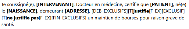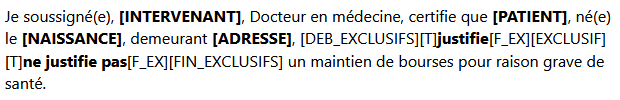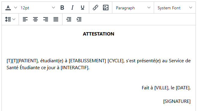 Saisissez votre texte dans le corps du certificat, en y ajoutant des balises de personnalisation. Ces balises seront automatiquement remplacées par les informations de l’étudiant courant et de l’intervenant courant.