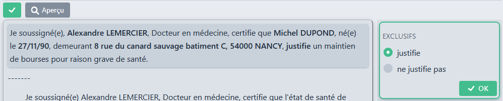 Cette page va permettre d’élaborer les certificats qui seront ensuite utilisés par les gestionnaires depuis la fiche médicale « Certificats ».