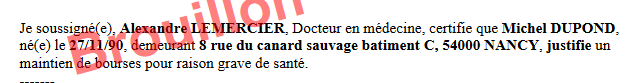 | ADRESSE | Adresse de l’étudiant | 8 rue du canard sauvage batiment C, 54000 NANCY |