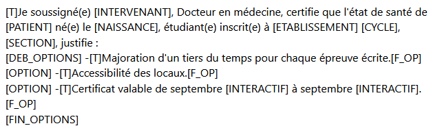 Ces balises permettent de définir une liste exhaustive d’options parmi lesquelles l’intervenant choisira celles à faire figurer sur le certificat.