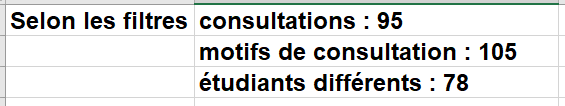 Calcule le nombre de consultations effectuées, le nombre de motifs de consultation totales et le nombre d’étudiants différents vu en consultation, et retourne une liste sous format Excel, en fonction de :