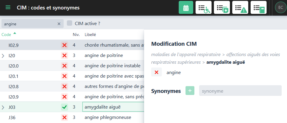Afin de faciliter le travail des médecins, il est possible d’ajouter à chaque terme de la CIM (Classification Internationale des Maladies) autant de synonymes qu’il s’avère nécessaire, pour que les habitudes de désignation des pathologies puissent être conservées.