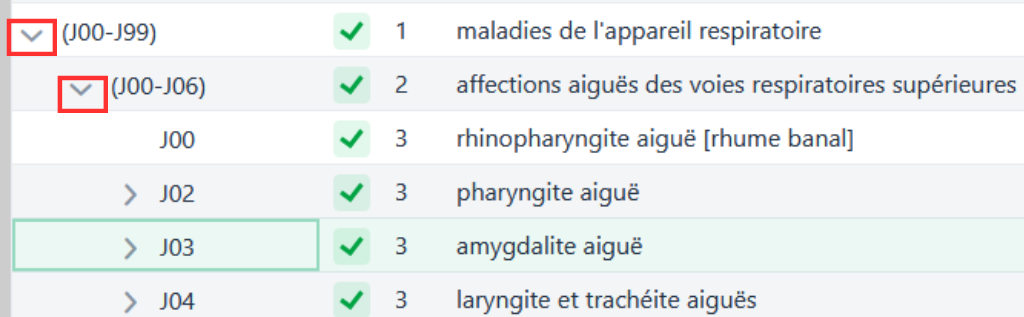 En cliquant sur la flèche située à côté du code de la CIM, il est possible d’étendre ou de diminuer les rangs inférieurs ou supérieurs.