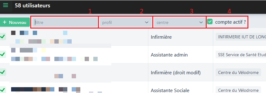 Afin de retrouver plus facilement les utilisateurs, plusieurs filtres sont disponibles :