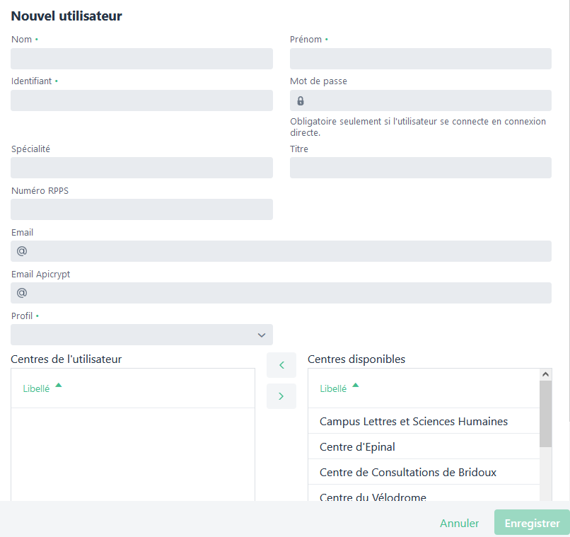 Le nom, prénom, identifiant, profil et au moins un centre doit être renseigné.