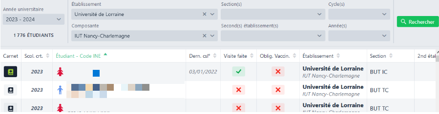 Cette colonne contient un bouton pouvant ouvrir le carnet de vaccination de l’étudiant :