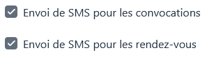 Si vous avez renseigné les paramètres liés à l’envoi de SMS, cette option permet d’activer l’envoi de SMS pour les convocations ou pour les rendez-vous.