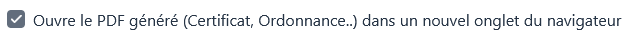 Cette option permet de définir si l’on veut ouvrir les documents PDF générés (certificats, ordonnance, etc) dans un nouvel onglet du navigateur ou directement dans Calcium